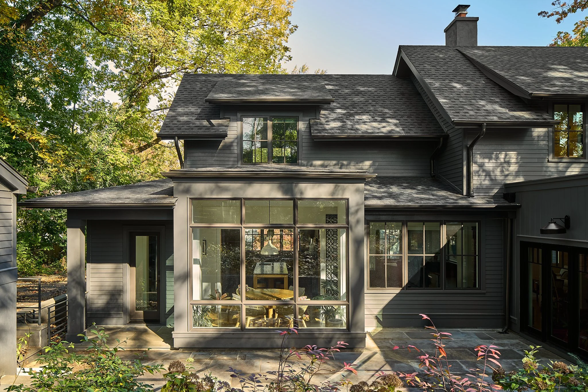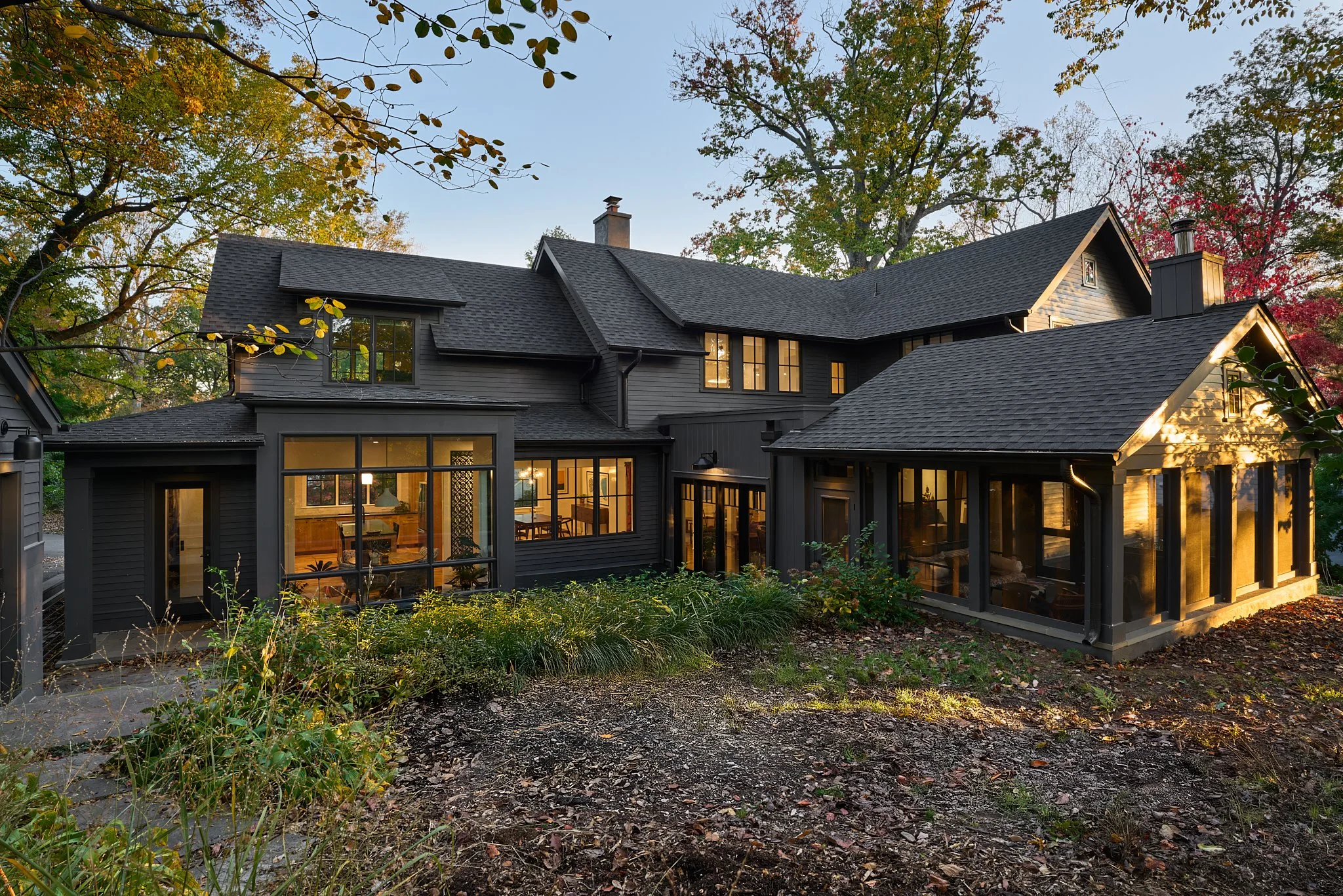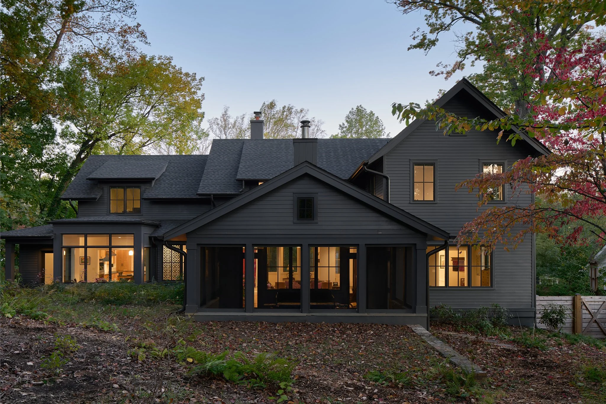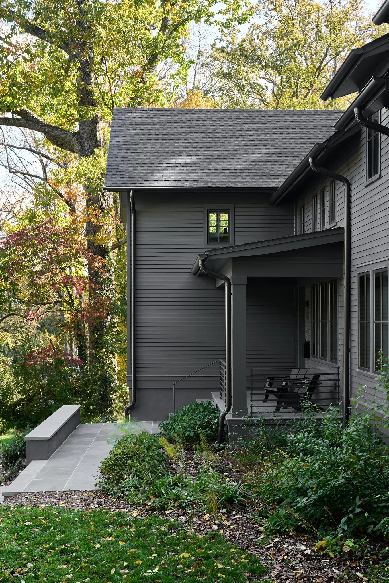Nestled on a wooded lot in the City of Falls Church, this renovation reimagines how a modern suburban home engages with its natural surroundings. Like a shadow in the woods, the house recedes into the trees, allowing the natural landscape to take center stage. A dark, monochromatic exterior contrasts with the vibrant softscape, heightening the colors and textures of the site.