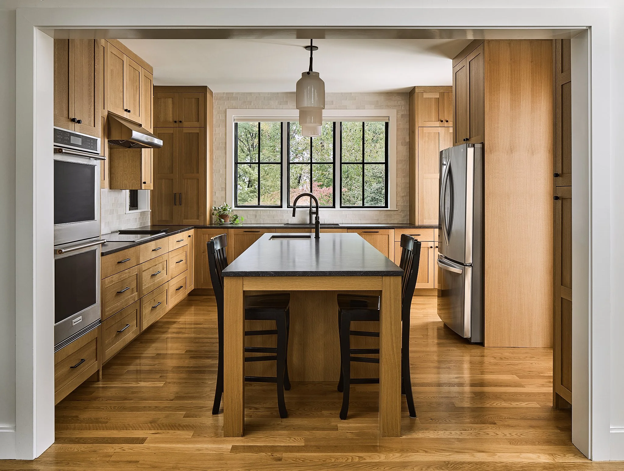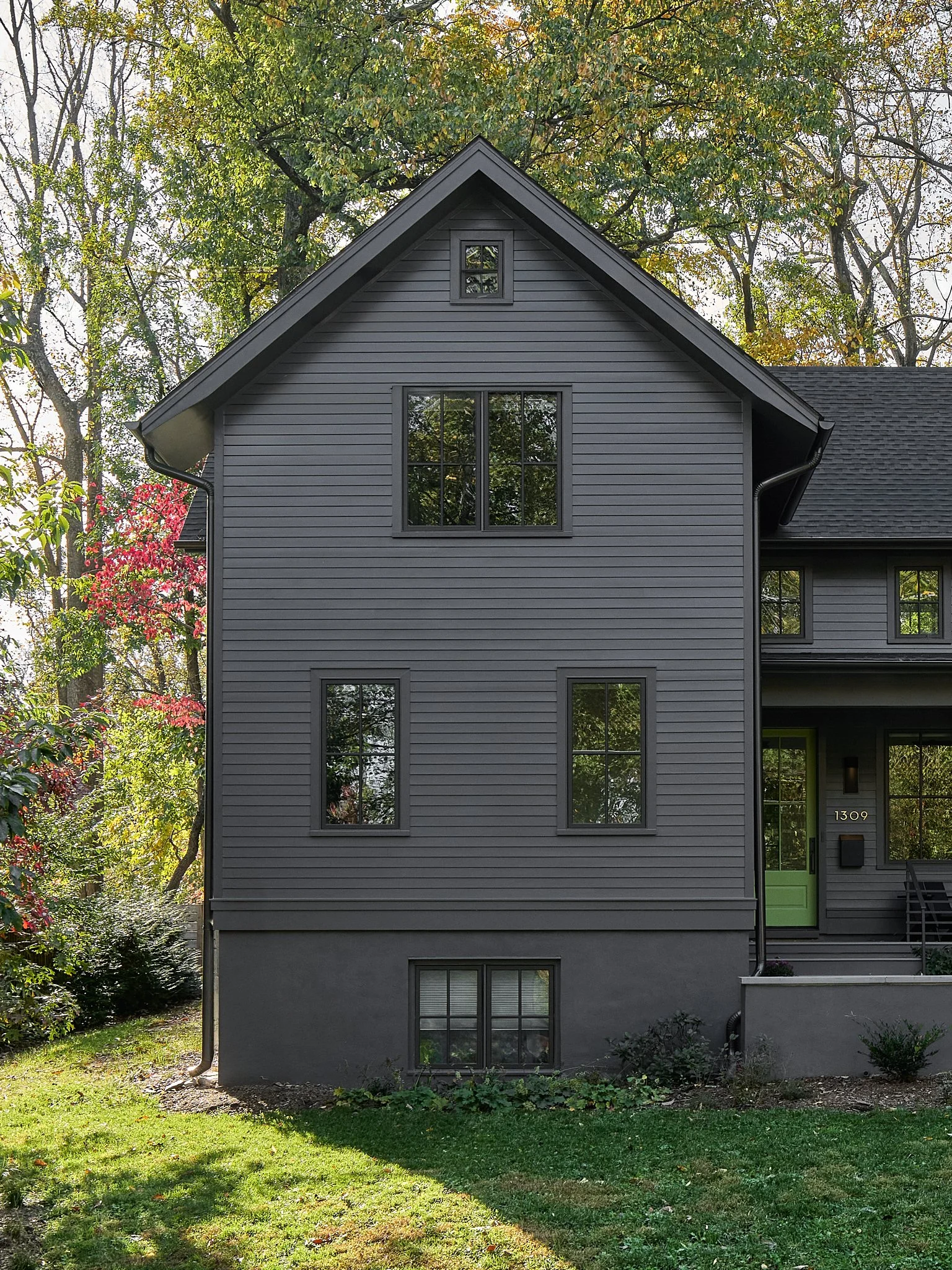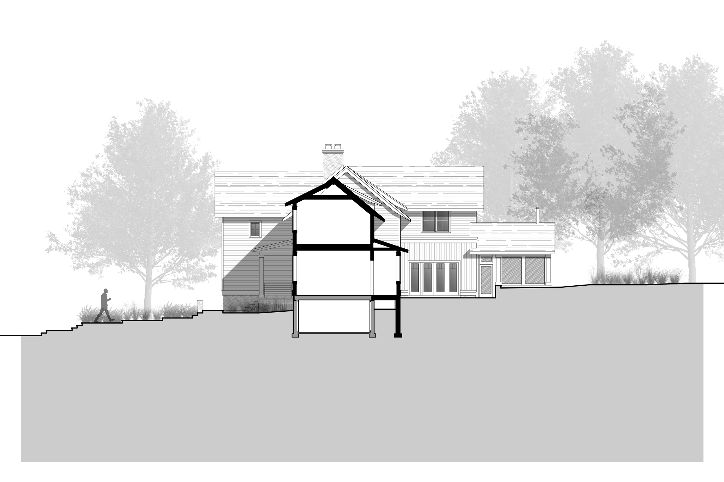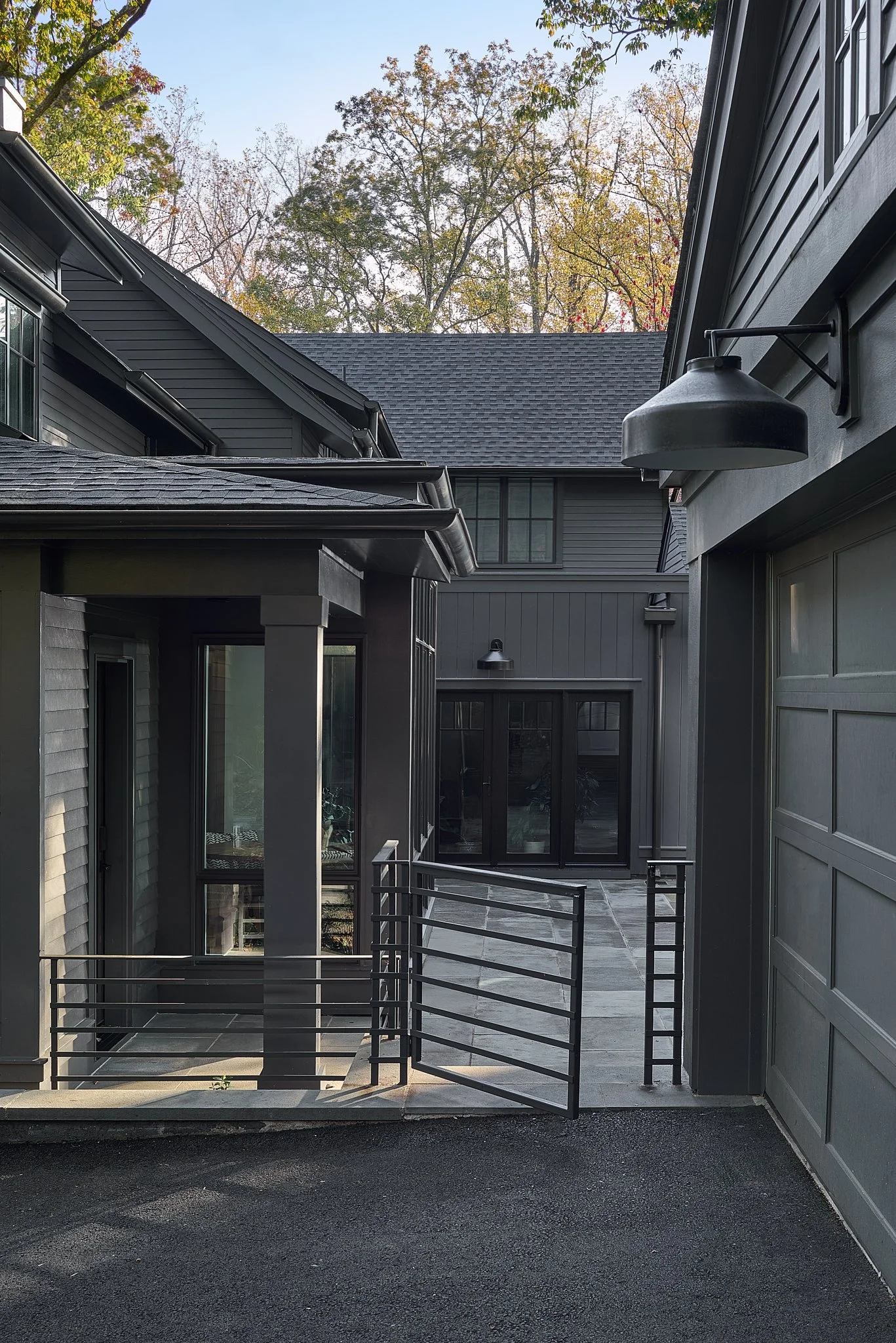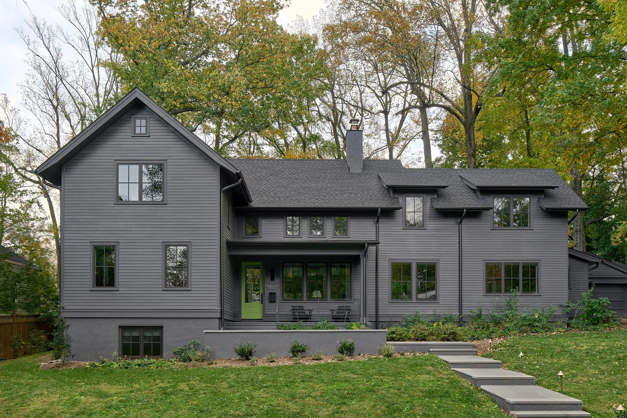 Nestled on a wooded lot in the City of Falls Church, this renovation reimagines how a modern suburban home engages with its natural surroundings. Like a shadow in the woods, the house recedes into the trees, allowing the natural landscape to take center stage. A dark, monochromatic exterior contrasts with the vibrant softscape, heightening the colors and textures of the site.