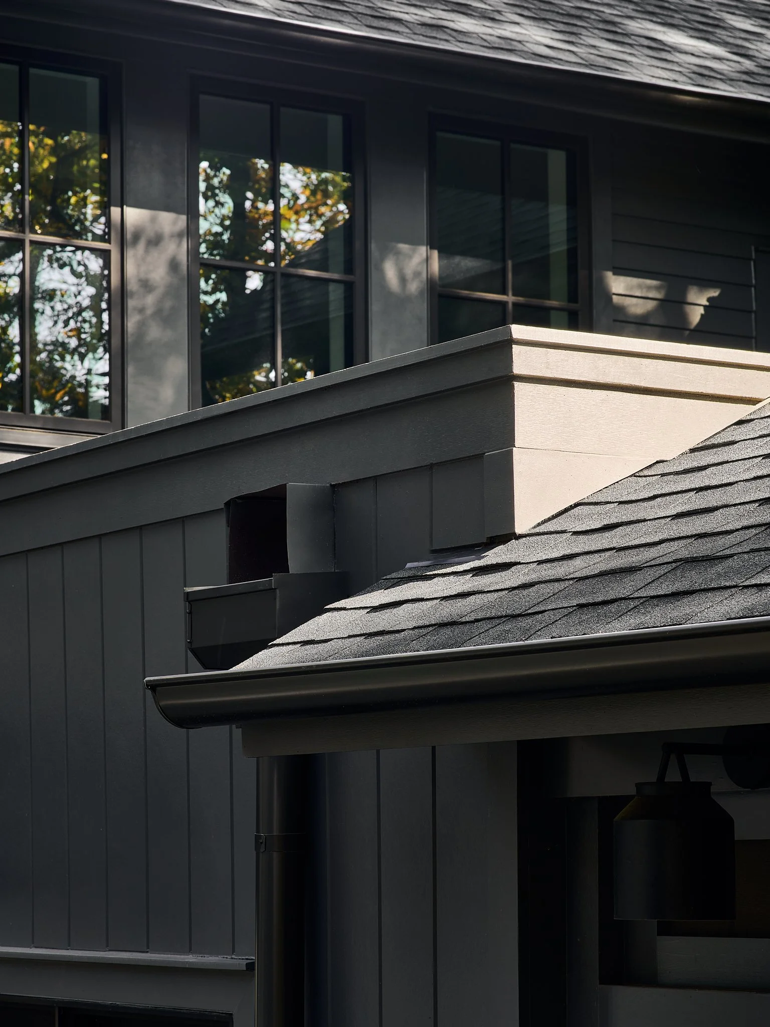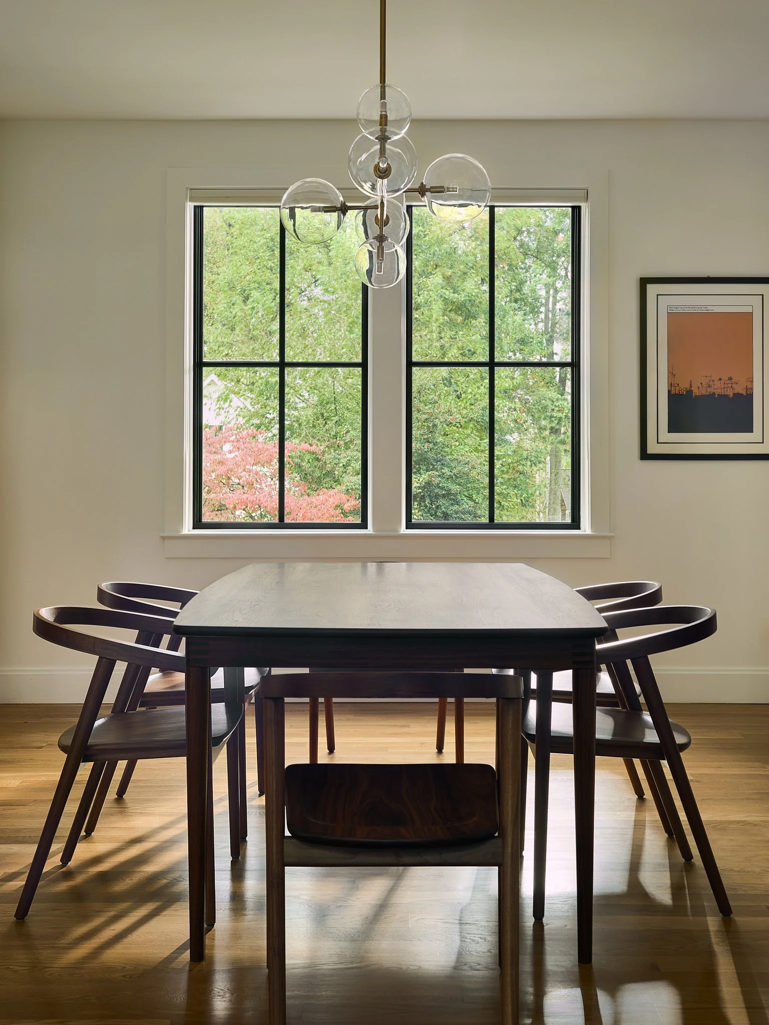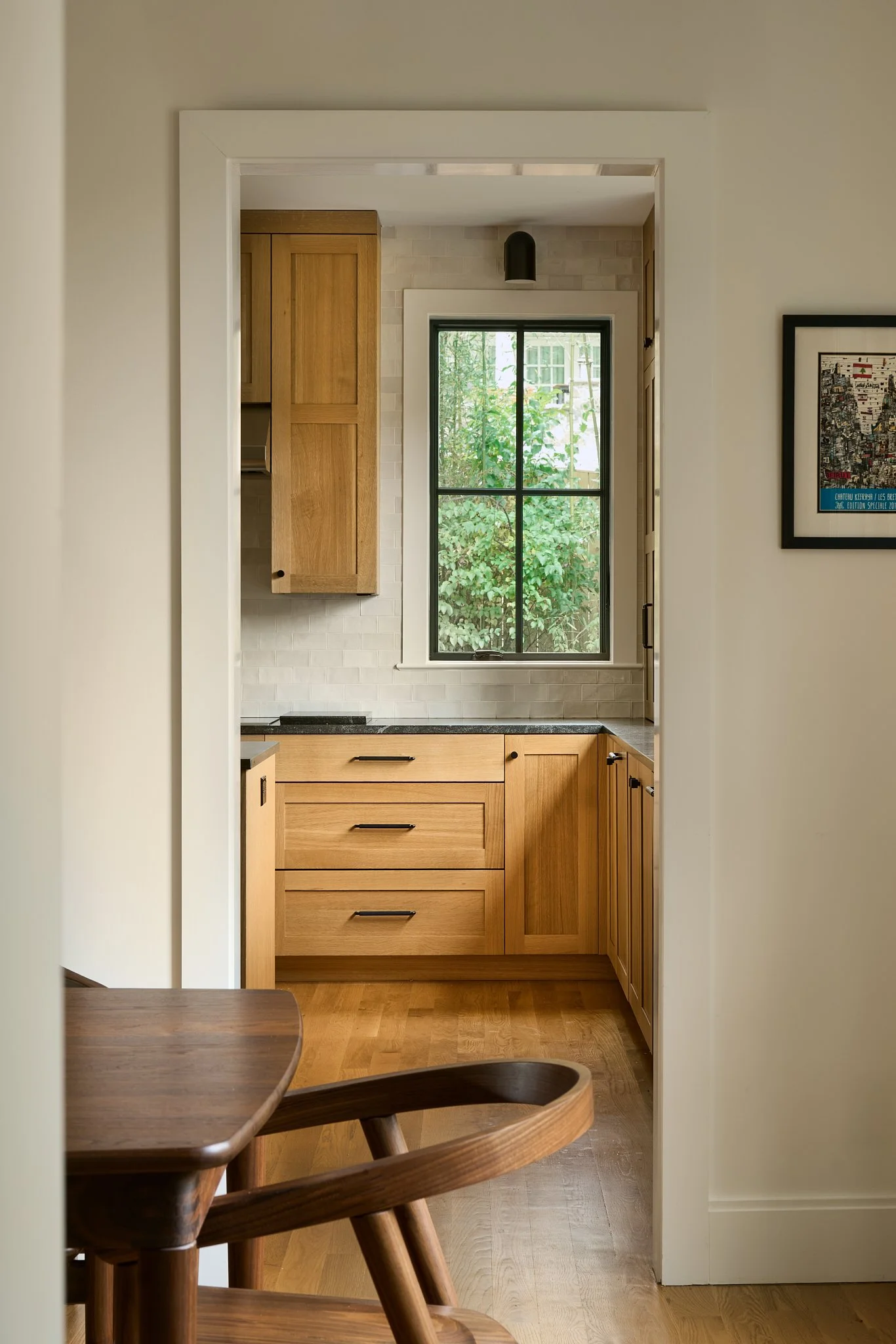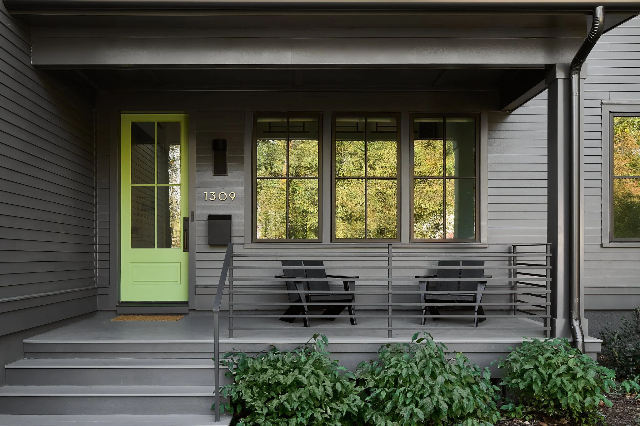 Nestled on a wooded lot in the City of Falls Church, this renovation reimagines how a modern suburban home engages with its natural surroundings. Like a shadow in the woods, the house recedes into the trees, allowing the natural landscape to take center stage. A dark, monochromatic exterior contrasts with the vibrant softscape, heightening the colors and textures of the site.