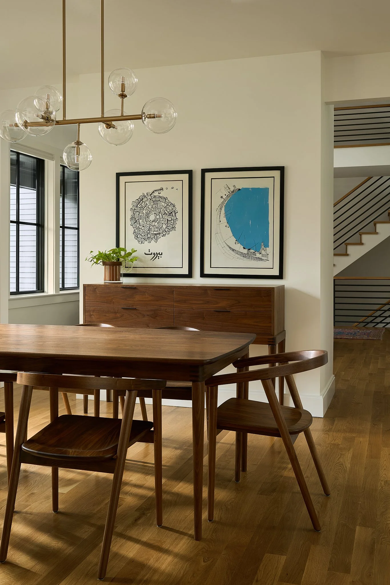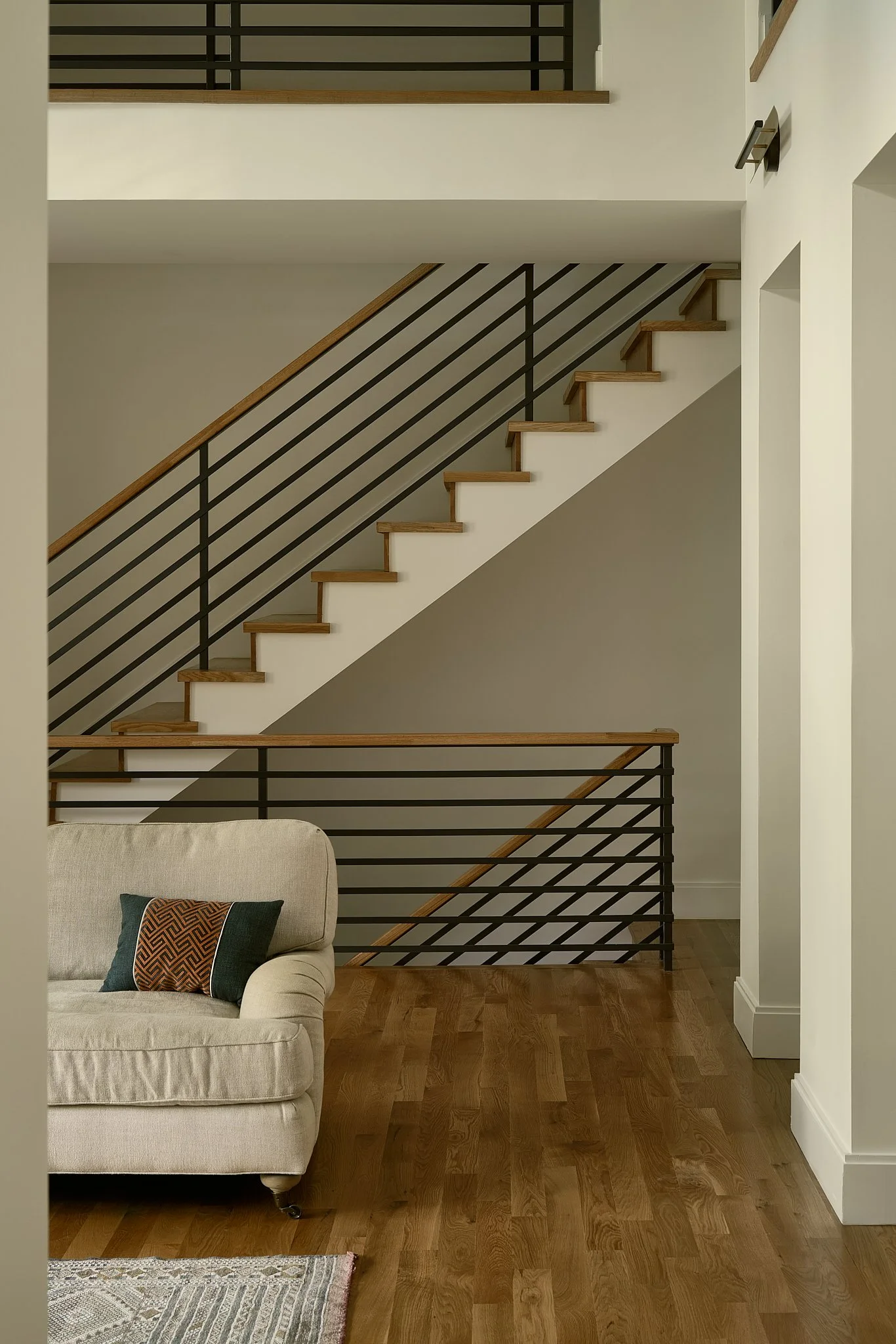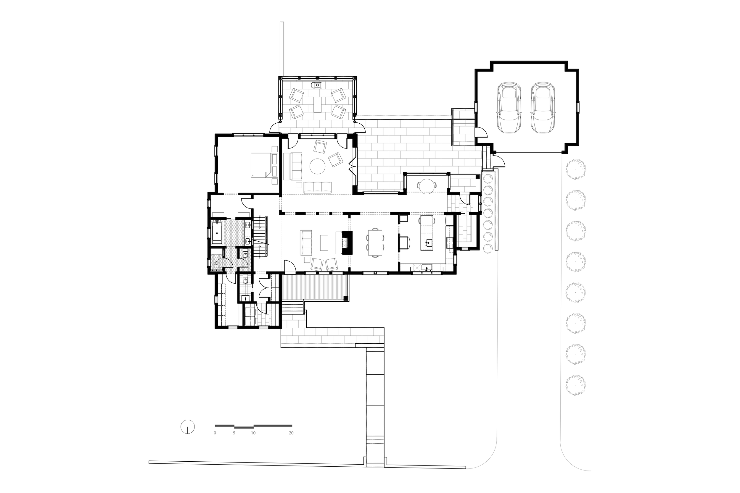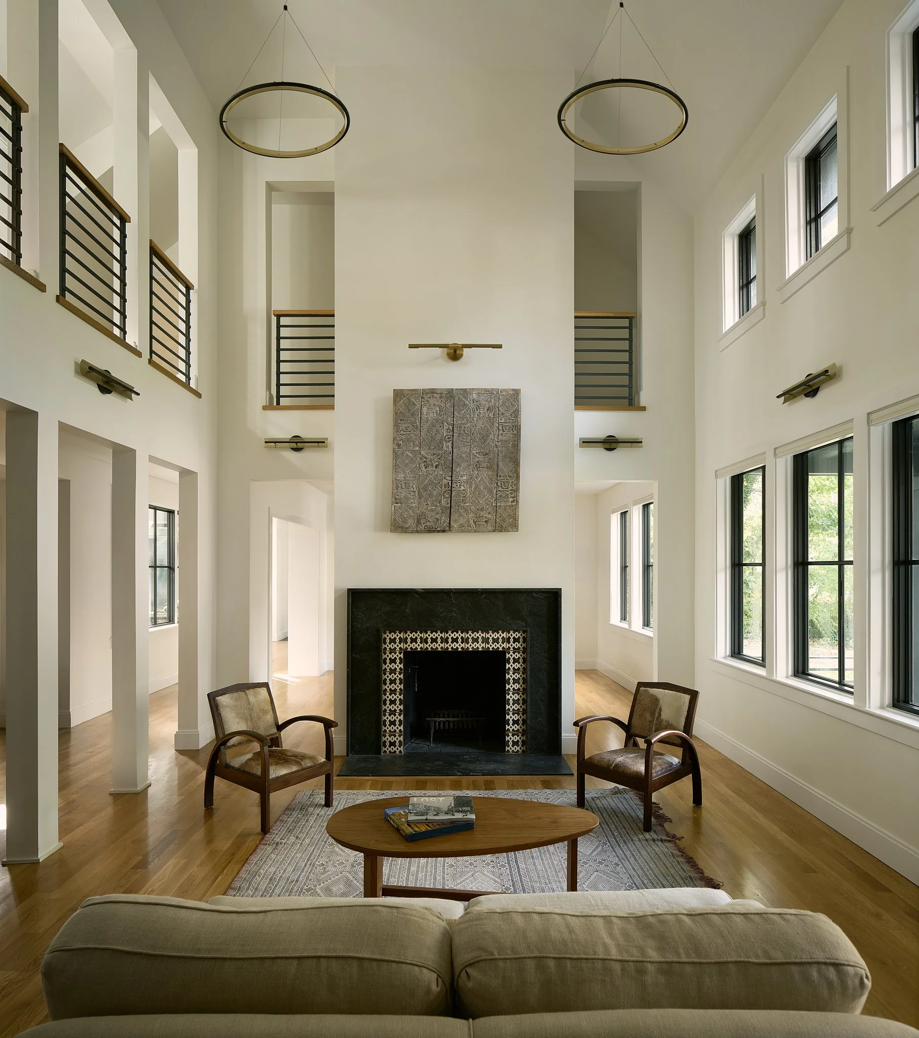 Inside, a strong circulation axis along the rear of the main level is washed in southern light, offering layered views to the backyard as you move through the home. A double-height family room anchors the plan, strengthening the connection between floors while drawing natural light deep into the interior. The integration of natural elements inside and out reinforces the home’s quiet, enduring relationship with its setting.